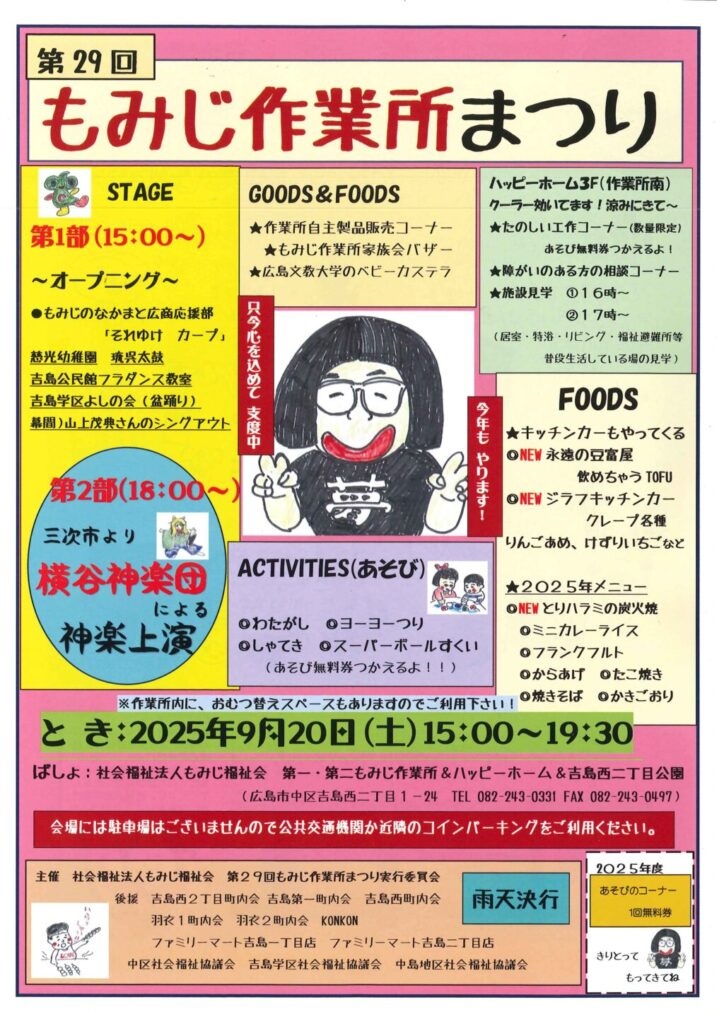 2025/09/16第29回もみじ作業所まつり開催のお知らせ 2025年9月20日(土)15時~より、第29回もみじ作業所まつりが開催されます。 詳しくは社会福祉法人もみじ福祉会のページをご覧ください。 第29回もみじ作業所まつり開催のお知らせ